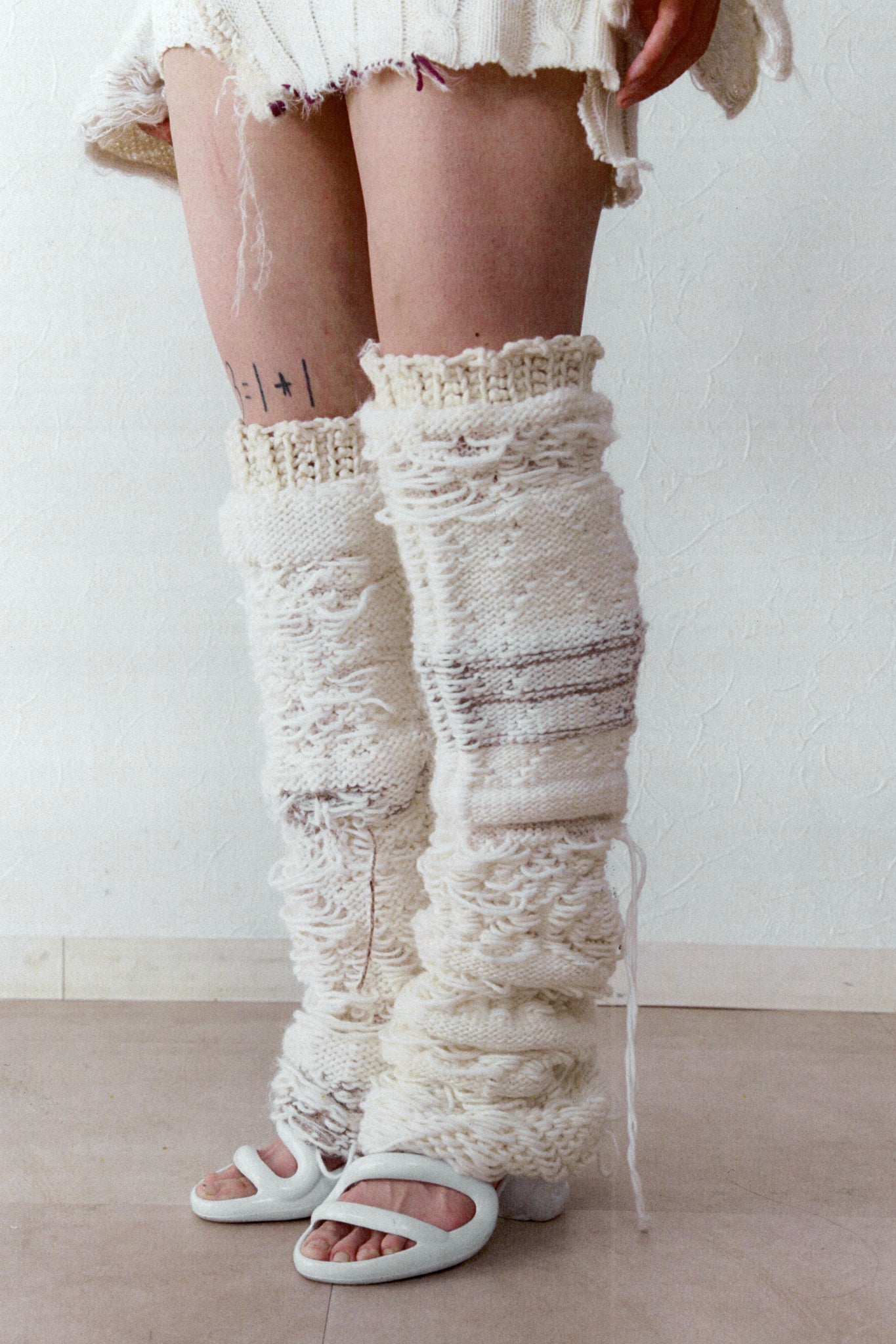 Jacquard knee-high leg warmers featuring a textured knit pattern.