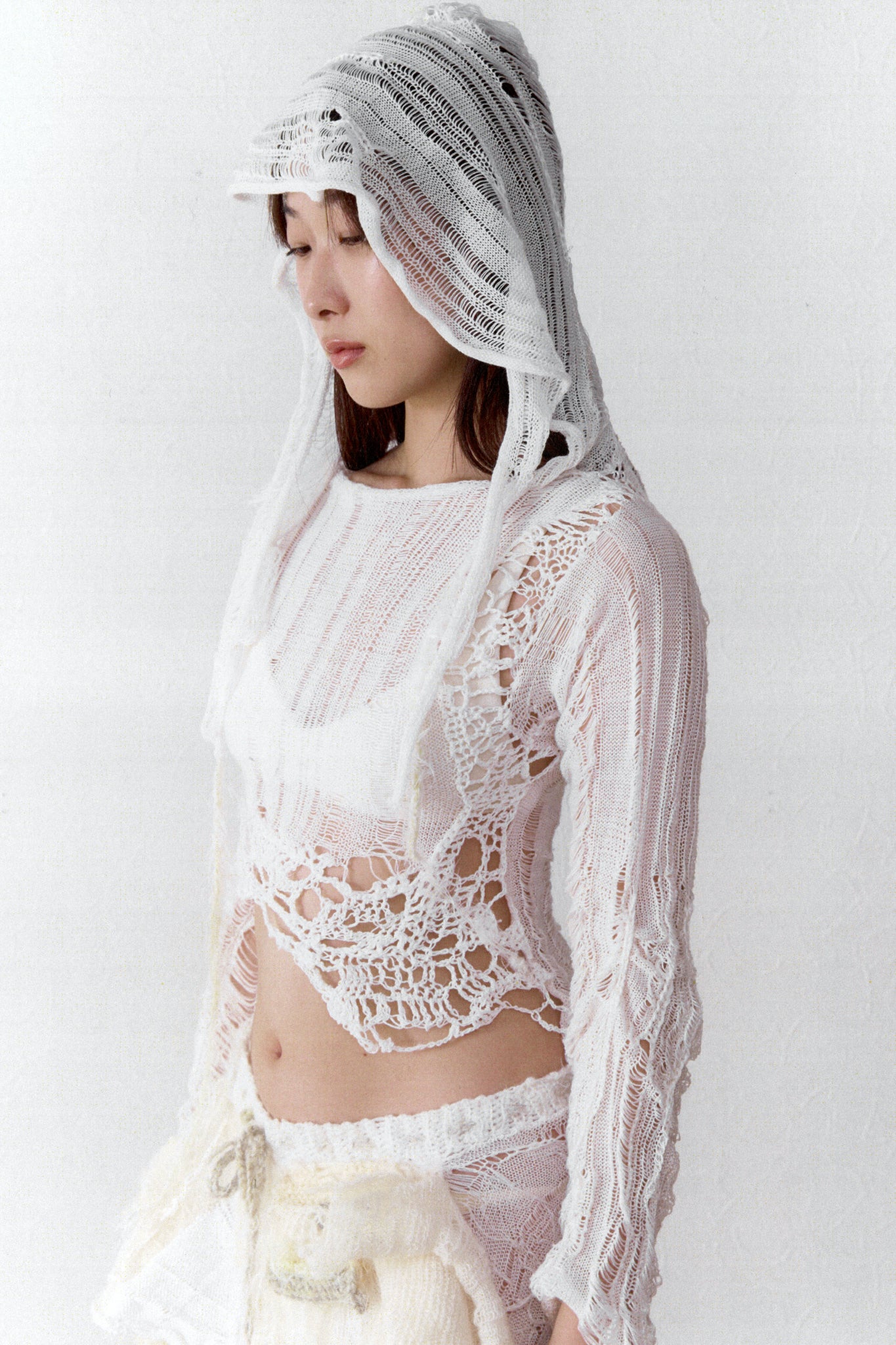 A cotton crochet patchwork hoodie with a raw, grunge aesthetic.