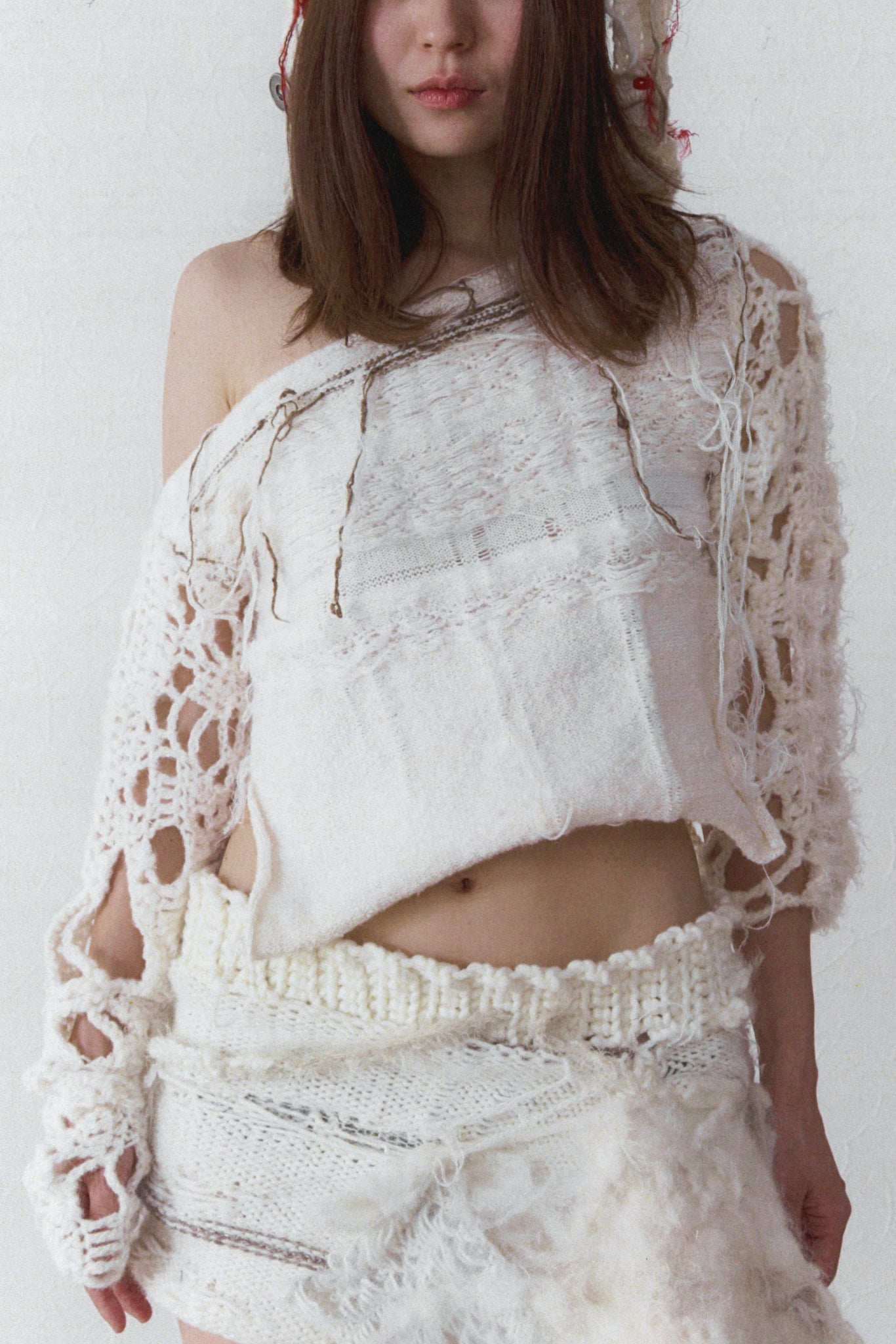 A knit top with hand-crocheted sleeves that add subtle texture.
